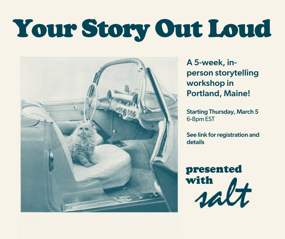 I’m interrupting my usual podcast emails to tell you about an exciting class I’m teaching here in Portland, ME, in person at Maine College of Art & Design. It’s starting March 5, Thursdays 6-8pm, and it’s going to conclude with an optional share of our stories for family, friends and fans!